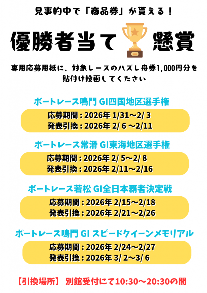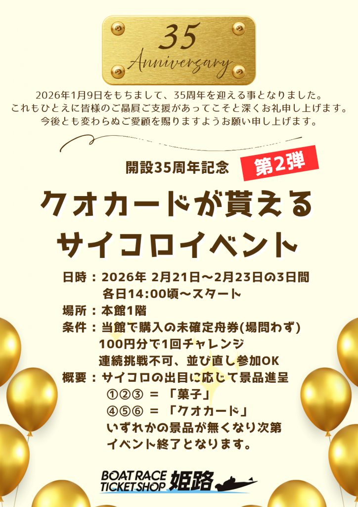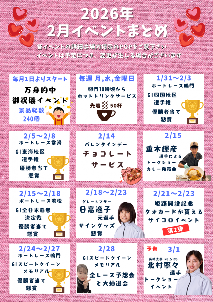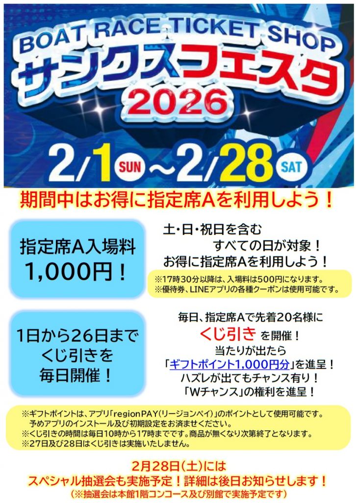 2026年2月1日(日)~2月28日(土)の期間中、指定席A(ボートレースチケットショップ姫路 本館4階)を中心に様々なイベントやサービスを実施します!